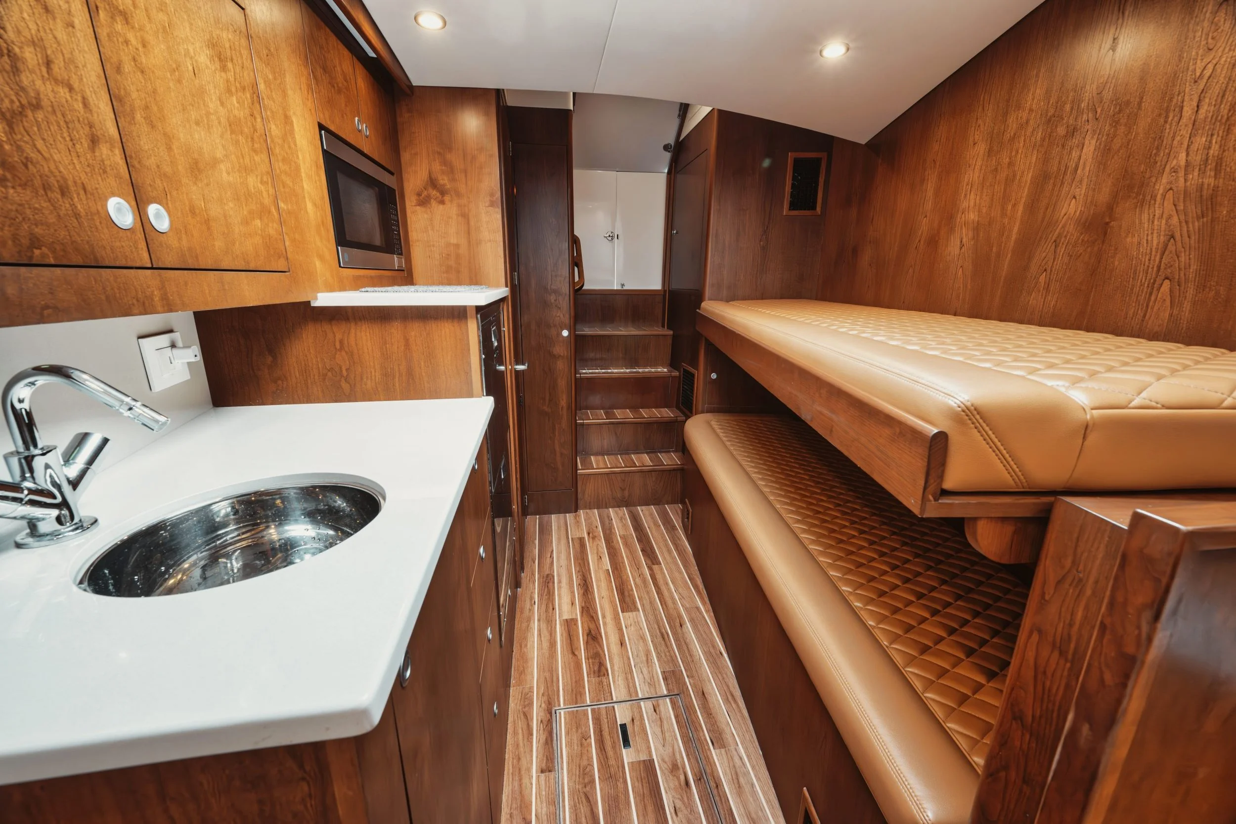 Her cabin is hand-built in New Jersey by real craftsmen who know that utility doesn’t have to mean ugly. You’ll find a dry bunk, secure stowage, a compact galley, and space to gear up without doing yoga. No fluff. No wasted inches. Just a clean, finished interior that holds up under real use.