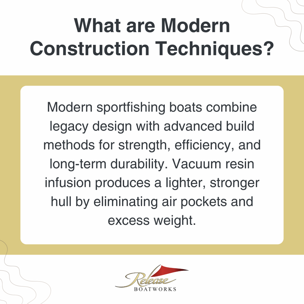 Release sportfish boats are built using advanced composite materials like fiberglass paired with vacuum-infused modified-epoxy resin for offshore strength and reliability.